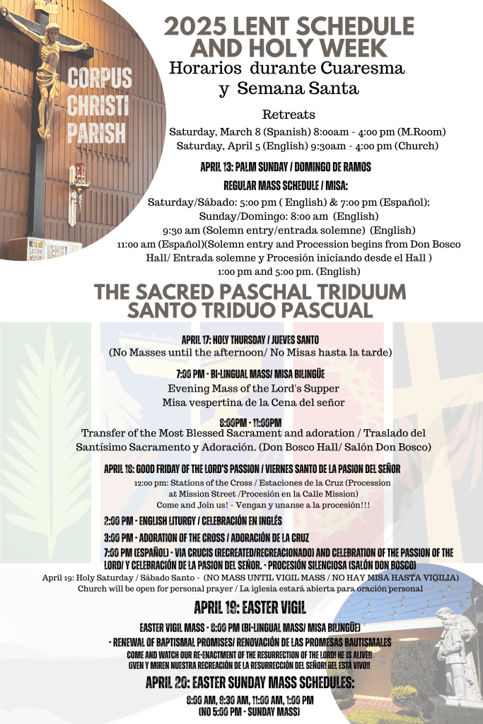 Miércoles de Ceniza 05 de Marzo en la Parroquia Corpus Christi 8:00 am, 12:05 y 7:00 pm Celebración Litúrgica.